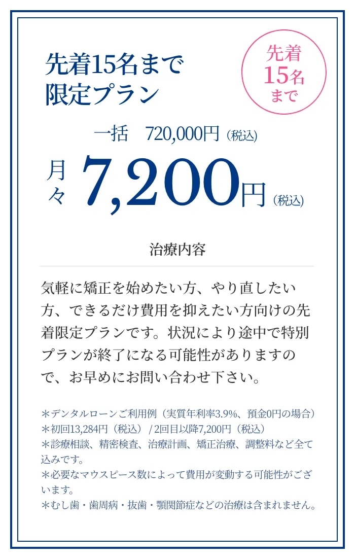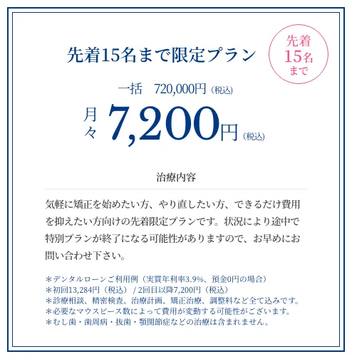 年齢による制限はありませんが、お口の状態により適応の可否が決まります。お子様であればお口の発育の状態を考慮し、また成人の方であれば治療後の経過を考えて決して無理のないご提案をします。